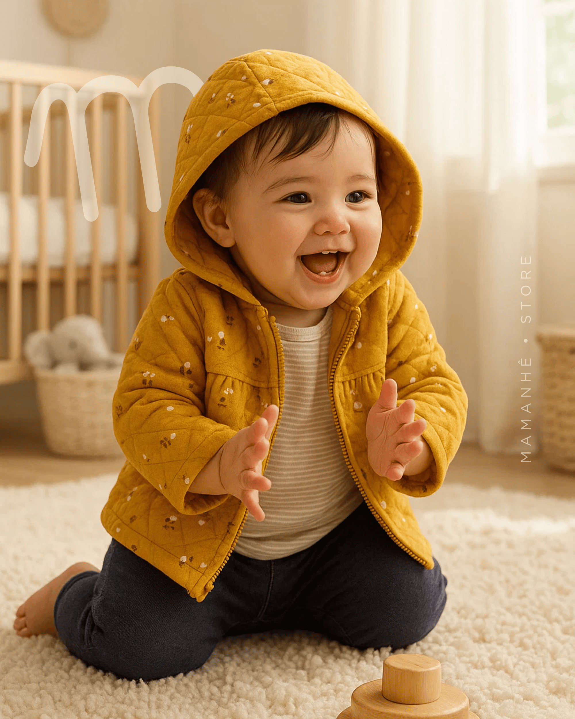 - Casaco quiltado, com tecido acolchoado e macio ideal para manter o bebê aquecido em clima mais frio